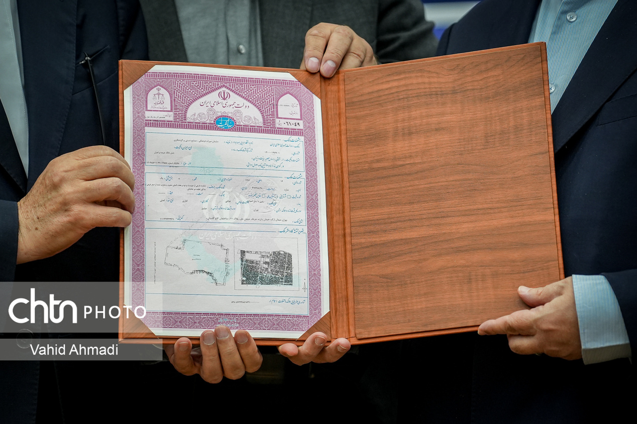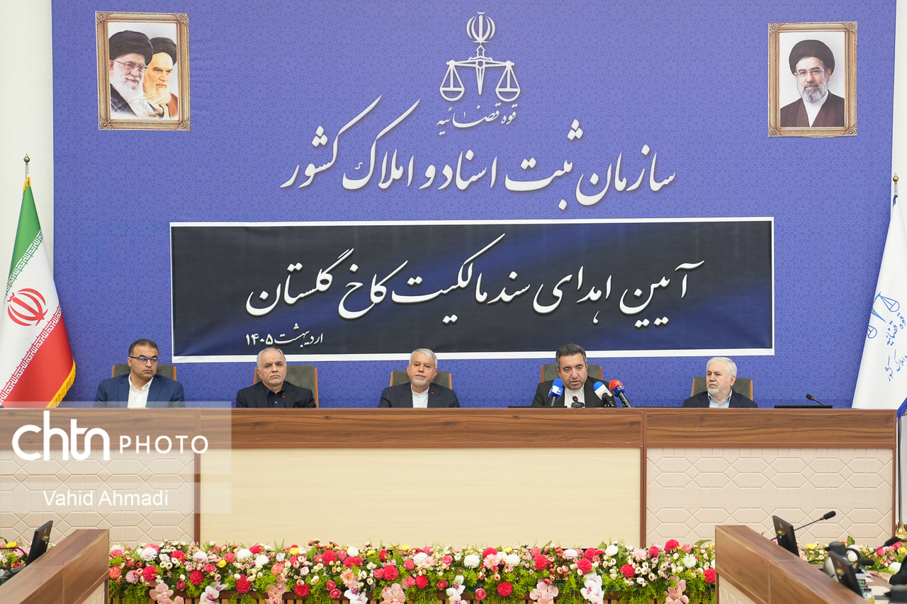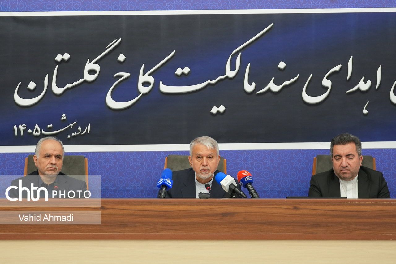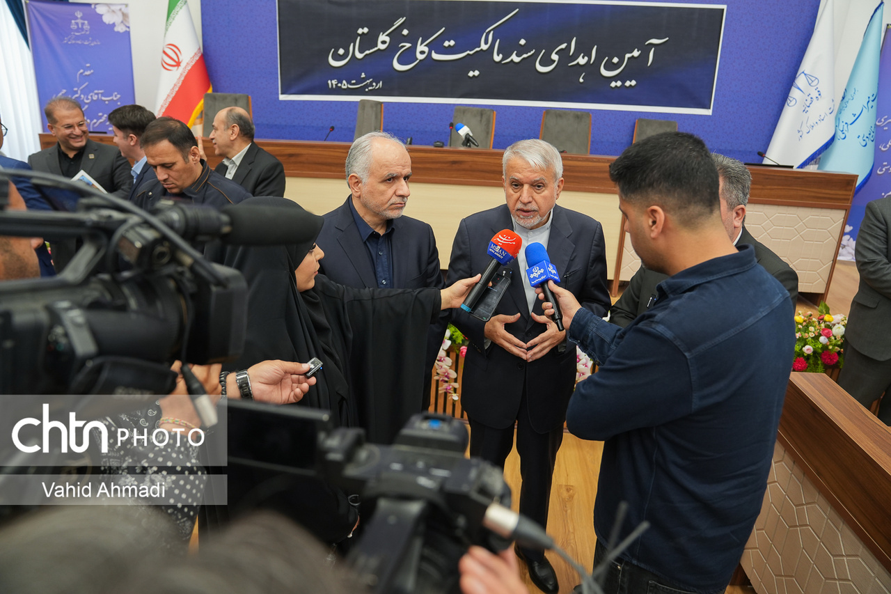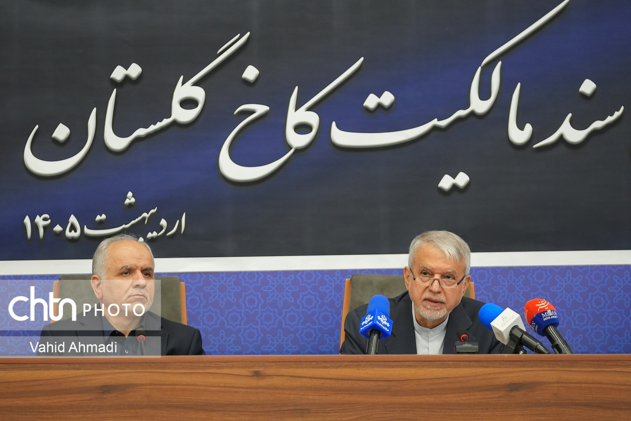 آیین اهدای سند مالکیت کاخ گلستان با حضور سیدرضا صالحیامیری وزیر میراثفرهنگی، گردشگری و صنایعدستی، امینحسین رحیمی وزیر دادگستری، حسن بابایی رئیس سازمان ثبت اسناد و املاک کشور، علی دارابی قائممقام وزیر و معاون میراثفرهنگی کشور و جمعی از مدیران دو دستگاه در محل سازمان ثبت اسناد و املاک کشور برگزار شد.